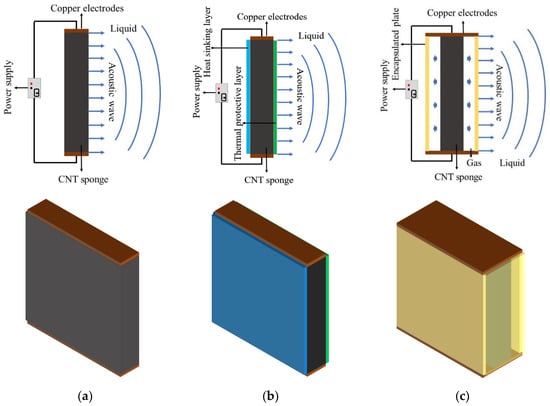 - Sandwich model: A layered configuration consists of a thermal insulation layer (made of polydimethylsiloxane, PDMS), a core of CNT sponge with two copper electrodes, and a thermal dissipation layer (the heat-sink of graphene on copper foil substrate, Gr/Cu). The heat-sink of graphene on copper foil substrate (Gr/Cu) was chosen as the heat-sinking layer because of its high-temperature resistance and excellent thermal conductivity [48]. This structure is intended to optimize the transducer’s performance by enhancing thermal management and TA efficiency.