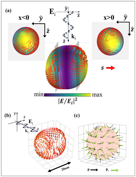 The evanescent waves generate a transverse spin momentum in addition to the usual orbital momentum resulting from the incoming beam. The resulting momentum acts on a probe particle, a phenomenon previously discussed in [27], observing a trajectory shift. Our investigation, unlike in [27], demonstrates that not only does the probe particle in the vicinity of the evanescent waves undergo trajectory modifications but the source itself, the resonant gold nanoparticle, undergoes the influence of their tSAM. The simulation model, designed with COMSOL Multiphysics v.6.2, involves a 10 nm radius gold sphere immersed in air and illuminated by a polarized plane wave of 530 nm in wavelength: the resonant wavelength for the plasmonic gold sphere. Figure 1 illustrates the resulting spin distribution () and spin momentum distribution () within the plasmon monomer, with the incident wave directed along the z axis and polarized along the x axis. The electric field distribution in this configuration exhibits an enhancement in the poles along the x axis (Figure 1a). As for Equation (5), the spin density () peak is at the same position of the electric field maximum, directed tangentially to the yz plane, resulting in vortex formations according to [40]. When observing the spin distribution along the spherical surface (Figure 1b), there are two distinct orientations of the vector, symmetrical to the yz plane. In particular, the spin vector along the surface with exhibits an anti-clockwise vortex, while the corresponding one at displays a clockwise vortex. Considering the correlation between the spin vector and the electric field component, the symmetry of the y and z components of the electric field defines the orientation of the spin vector and its dependence on the hemisphere considered. This property is valid for any linear polarization, so it is possible to generalize the concept as follows: given a linearly polarized wave on a resonant gold nanosphere, exhibits the maximum intensity in the poles along the axis of polarization, forming vortices with a direction anti-symmetrical to the plane orthogonal to the polarization direction considered.