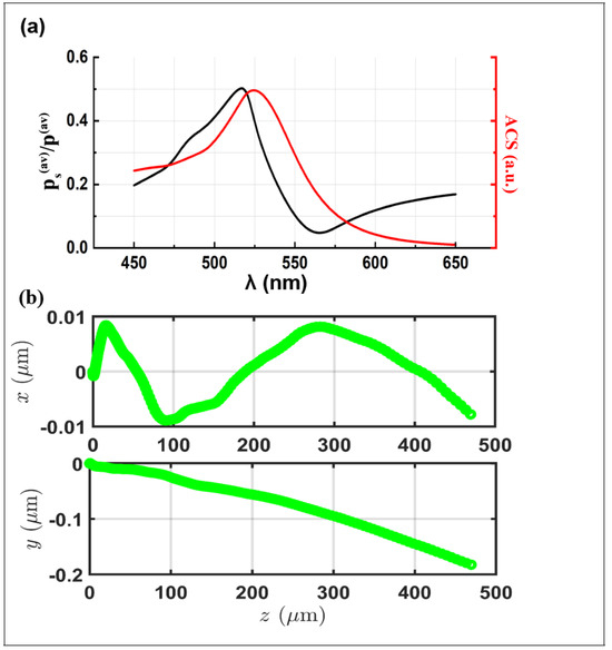 (a) Absorption plot (ACS) as a function of the incident wavelength (red line) and the ratio between the average spin momentum and the average momentum of the Poynting vector as a function of the incident wave () (black line). (b) The trajectory of a resonant gold nanoparticle under incident beam influence polarized along x.