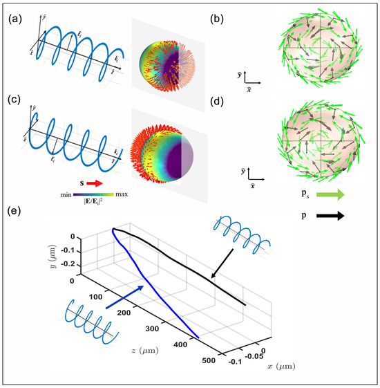 Given a right circularly polarized (RCP) beam incident on the resonant gold particle (Figure 3a), the resultant electric field reaches the maximum intensity along the surfaces orthogonal to the axis of incidence of the beam (in our case, the z axis). Consequently, the spin density () exhibits significant amplitude concentrated within one hemisphere of the nanoparticle, breaking the axial symmetries observed in linear polarization (Figure 1a). In the xy plane, the spin density vector has a radial direction directed outward on the sphere surface (Figure 3a). The vector (Figure 3b) has an amplitude, according to Equation (5), mainly distributed in the same hemisphere of the spin density distribution but tangential to the surface of the sphere, forming a clockwise vortex. In the left circularly polarized (LCP) scenario (Figure 3c), both the spin vector () and the spin momentum vector () follow a similar pattern as observed in the RCP case. However, their distributions maintain equivalent amplitudes compared to the RCP spin density, although displaying an inverted orientation within the xy plane (Figure 3d). From these simulation outcomes, it is evident that alterations in the electric field vectors with varying beam helicity generate changes in the spin orientation and its associated moment along the nanoparticle surface. This behavior regarding the spin momentum significantly influences the dynamics of the gold nanoparticle (Figure 3e), remembering that, when the gold particle approaches the plasmon resonance, the Poynting momentum has a relevant Belinfante term (Figure 1c). Consequently, the contribution of generates dynamics distinct from those typically induced by the momentum. Specifically, there are two different force effects associated with the spin momentum: