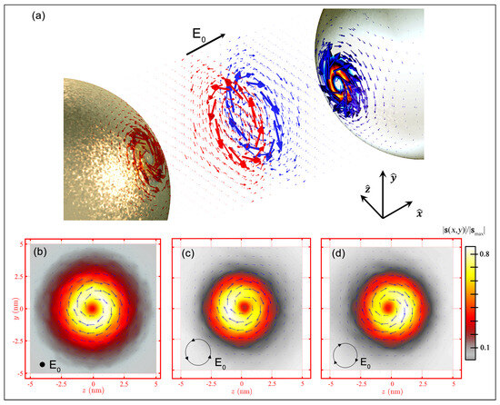 Analyzing the results, it is evident that, for LSP resonances in a gold nanoparticle, the trajectories are influenced by the spin momentum, resulting in shifts perpendicular to the direction of the incident beam. The literature often highlights how a probe particle placed in an evanescent wave (SPPs or LSPs) [1,27] presents a force contigent upon the SAM. However, in this paper, the system generates an evanescent wave, and, through the formation of spin momentum, it follows trajectories reliant on the polarization of the incident beam, owing to the induced plasmonic field. The ability to manipulate the position of a resonant system using a simple plane wave offers intriguing advantages, particularly in the plasmonic propulsion for the nanoparticle exit angle control [31,32,33]. In addition, functionalizing the plasmonic system holds promise in biosensing, drug delivery, and cancer therapy applications [25,26]. In the case of nanoparticle dimers, the electric field is spatially distributed within the dimer gap, and, consequently, the spin distribution is also present. The spin vector distribution in a dipole case tends to form vortices that overlap at the gap center, creating a spin singularity. The singularity formation, similarly to the monomer case, is influenced by the incident polarization and inter-nanoparticle distance. The presence of a singularity between a vortex and an anti-vortex confirms the existence of a topological charge in the plasmonic dimer system. The topological invariance, facilitated by the spin–orbit interaction (SOI), finds applications in spin optics, i.e., in the creation of metasurfaces [23,24], or in the semiconductor junctions controlled by the incident photon helicity [41].