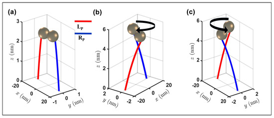 In the resonant gold monomer, the SAM behavior resulting from the evanescent surface plasmonic alters the nanoparticle trajectory, inducing a displacement dependent on the orientation of the Belinfante momentum (). The spin–orbit effect in more intricate plasmonic configurations, the gold dimers, is now discussed. In the dimer, the resonant electric field shows an enhanced field localization within the gap between the gold particles [34], altering the characteristics of the spin vector associated with the system. The unique field distribution of the dimer generates a nontrivial topological configuration in the spin momentum. The spin distribution depends not only on the polarization of the incident beam, similarly to the SAM observed in the monomer, but also on the gap size between the two particles. Figure 4 shows the spin distribution (amplitude and orientation) of the dimer composed by two gold particles 10 nm in radius positioned parallel to the x axis, separated by a 1 nm gap, and exposed to incident polarized light, with a wavelength of 550 nm, directed along the z axis. In a dimer illuminated by an x-polarized incident beam, the field distribution, as reported in the literature [34], is enhanced within the gap between the two spheres. From Equation (5), the spin distribution has a higher intensity within the gap rather than along the surface of the nanoparticle, in contrast to the monomer behavior. Since the electric field components exhibit symmetry to the center of the gap, the spin vector aligns tangentially to the yz plane, orthogonal to the gap direction, forming a counterclockwise vortex near the left nanoparticle and a clockwise vortex near the right particle (Figure 4a). As one approaches the center of the dimer, where the electric field is most intense, the two vortices interact, altering their shapes until reaching the center of the gap, where the superposition effect is most pronounced, giving rise to a spin singularity. The amplitude distribution (Figure 4b) illustrates a symmetrical concentration of spin along the gap axis. As in Equation (5), the symmetric distribution of the electric field along the direction of the dimer gap corresponds to a similar characteristic exhibited by the spin. As the distance from the hotspot increases, the spin vector decreases in amplitude as a consequence of the direct correlation between the evanescent electric field component and the spin component. Similar to the behavior observed in the gold monomer, the presence and distribution of the spin vector on a specific surface are contingent upon the incident polarization. When illuminated with a y-polarized beam, i.e., transverse to the dimer gap direction, the electric field distribution is along the xz plane; thus, there is no excitation within the dimer gap. Due to the spin–electric field correlation, the spin vortex emerges along the xz surface of the nanoparticles, avoiding the dimer gap. As a result, in each nanoparticle, the spin distributions remain separated, precluding the formation of a spin singularity within the gap. Under illumination by a circularly polarized wave, the scattered electric field exhibits y component asymmetry dependent on the incident helicity. This asymmetry induces a helicity-dependent spin distribution manifested by the presence of a spin concentration in some areas of the gap. For LCP polarization (Figure 4c), this concentration appears in the area with , while, for RCP polarization, it resides in the area with (Figure 4d). The behavior of the spin vector within the dimer has been previously investigated for various configurations, with a focus on the polarization-dependent effect. Figure 5 illustrates how the spin momentum, directly correlated with the spin vector, according to Equation (5), impacts the dynamics of the resonant gold dimer, resulting in displacements influenced by the incident helicity and polarization. In the linear polarization case, especially along the axis parallel to the dimer gap, an enhanced version of the tSAM generates a transverse moment . This effect, evident in the dynamics of the dimer (Figure 5a), generates motion along the z-axis, elevating the dimer in addition to the expected motion along the gap axis, driven by the orbital momentum that attracts the two nanoparticles. For circularly polarized waves, the intrinsic helicity generates asymmetry in the x component of the spin, whose direction depends on the helicity; consequently, helicity-dependent momentum along the y direction is also formed. The dimer trajectory adopts a clockwise spiral shape in the RCP case (Figure 5b) and a counterclockwise pattern in the LCP case (Figure 5c).