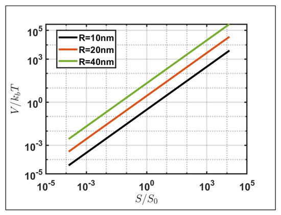 For future prospects, the experimental implementation to analyze the spin behavior resulting from gold nanoparticles placed in water and a comparative study against the simulated analysis become imperative. First of all, the spin-induced trajectories are simulated assuming the surrounding environment to be air, while the nanoparticles will be placed in an aqueous solution for experimental verification. However, the analyses conducted on the motion of nanoparticles induced by the spin momentum are independent of the refractive index considered, excluding the increase in the frictional force caused by a denser medium but solely dependent on the incident polarization. Moreover, when assessing the experimental feasibility of the phenomenon in question, it is essential to account for the influence of Brownian motion, which introduces stochastic fluctuations in the trajectory of suspended gold nanoparticles [42,43]. Thus, a crucial aspect involves estimating the incident energy density necessary for the system to minimize the impact of the Brownian motion energy (kBT) on the trajectory of the nanoparticles. Figure 7 illustrates the electromagnetic energy normalized with in the function of the incident power density, normalized at 1 mW/m2, a common value for microscopic element analysis. The plot considering different nanoparticle sizes reveals that, for power densities in the range of 10–100 mW/m2, the electromagnetic energy exceeds the Brownian motion energy, affirming the experimental feasibility for the simulated spin–orbit phenomena. The required power density value depends on the nanoparticle size since the electromagnetic energy is related to the volume of the nanoparticle considered.