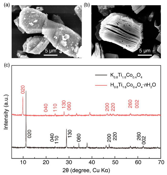 The layered phase K0.8Ti1.6Co0.4O4 and proton phase H0.8Ti1.6Co0.4O4·nH2O powders were synthesized by solid phase reaction as described in the experimental section [17]. Figure 1a shows the SEM image of the layered compound K0.8Ti1.6Co0.4O4. It can be seen that most of the powder samples were distributed in flat lumps and slightly swollen, with powder sizes between 10 μm and 15 μm, and the lamellar structure was apparent. After mixing hydrochloric acid and K0.8Ti1.6Co0.4O4 sufficiently, H+ in HCL replaced the alkali metal ion K+ in the lamellar compound. As the reaction proceeded, H2O molecules also entered the middle of the lamellae of the layered compounds, and the reaction product, proton phase H0.8Ti1.6Co0.4O4·nH2O, was finally obtained. The SEM image was shown in Figure 1b, and a very obvious layered structure can be observed. Figure 1c compares the XRD diagrams of the layered compounds K0.8Ti1.6Co0.4O4 and H0.8Ti1.6Co0.4O4·nH2O, respectively, in which the same crystallographic indices are labelled. It can be found that the peaks of the H-phase compounds were shifted to the left compared with those of the lamellar phase compounds, which indicated that the acid-exchange reaction was complete, which made the interlayer spacing larger. The combination of the SEM images together proved that the proton phase compounds were successfully synthesized.
