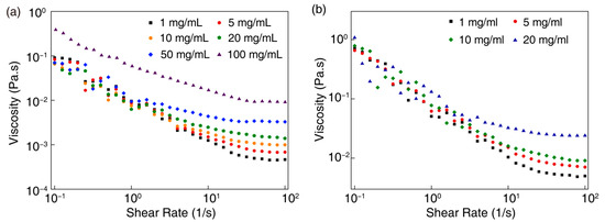 (a) Viscosity versus shear rate for (a) small- and (b) large-sized nanosheets.
