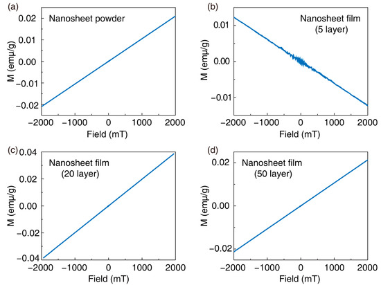 To investigate the influence of film thickness on the performance of inkjet-printed films, we tested the magnetic properties of films printed with 5, 20, and 50 layers. Before this, we tested magnetic Ti0.8Co0.2O2 nanosheet powders, which exhibited paramagnetism, as shown in Figure 5a. It was worth noting that the reported magnetic behavior of Ti0.8Co0.2O2 nanosheets so far pertained to ultrathin films [12,16,27]. These films possessed extremely high density and orientation, with insulating layers between each layer to maintain isolation and avoid the anisotropic behavior of spin electrons in different orientations, which may affect the magnetic properties of ultrathin films. Due to Ti0.8Co0.2O2 nanosheets being composed entirely of surface atoms arranged in a two-dimensional array, the surface Co spin and its local ferromagnetic coupling were very strong. However, in magnetic powders, the orientation of nanosheets was non-uniform, leading to paramagnetism in Ti0.8Co0.2O2 nanosheet powders, as shown in Figure 5a. We tested the magnetic properties of printed 5-layer, 20-layer, and 50-layer films at room temperature, as shown in Figure 5b–d. The results showed that the 5-layer and 20-layer printed films exhibited the same paramagnetic behavior as the powder, indicating that the magnetic behavior identical to the nanosheet powder was maintained even in long-range ordered printed films. However, the reason the printed films did not exhibit significant ferromagnetism may be due to interference from the quartz substrate during testing and poorer orientation caused by insufficient stacking of nanosheets when the number of layers was low. The 50-layer printed films displayed pronounced diamagnetic behavior, indicating that as the thickness of the film increased, Ti0.8Co0.2O2 nanosheets struggled to maintain uniform orientation. Although significant long-range ordered behavior was observed, it did not contribute to maintaining the magnetic properties of the nanosheets in the case of the 50-layer film. Research on magnetic films requires minimizing film thickness while meeting densification requirements. As an efficient printing method without masks, inkjet printing has been successfully demonstrated in our work to have the capability to print dense, long-range ordered, ultrathin films. However, the densification of magnetic films still needs improvement. In future work, utilizing large-sized magnetic nanosheets and printing techniques with good film-forming orientation, such as spin coating and blade coating, may further enhance the magnetic performance of printed films.