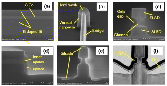 SEM micrographs: (a) epitaxially grown Si/SiGe/Si multilayers, (b) the tilted image of 3D nanostructure, (c) after qALE, (d) after inner spacer and sidewall spacer formation, (e) after silicide formation in structure wafer, and (f) TEM image after HKMG process. Reprinted with permission from ref. [9]. Copyright 2021 IEEE Publisher.