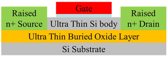 The key difference between SOI MOS and a conventional MOS structure is the buried oxide layer (BOX) of SOI, which separates the transistor from the substrate. As shown in Figure 6, the thin transistor channel is fully depleted during operation and sandwiched between two insulating layers. Usually, the channel thickness is around 1/4–1/3 of the gate length. To avoid the large access series resistance caused by the direct growth of metal silicide, the structure of the raised source/drain (RSD) is generally adopted [62,63,64,65], as is shown in Figure 7.