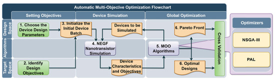 Although a lot of progress in atomistic simulation with AI has been made in recent years, the computational cost is still too expensive to satisfy the massive simulations demanded by the industry. Bridging TCAD and AI in the Drift-Diffusion framework, i.e., the semiclassical level, is more compatible to current sub-5 nm node development. To this end, the following updates have been proposed and addressed by several academic and industrial research groups. In general, traditional Design of Experiment (DOE) using TCAD is time-consuming due to a huge number of calculations. A possible remedy for this problem is machine learning-based modeling. It is commonly shown in recent studies that artificial neural networks (ANNs) have a remarkable ability in capturing nonlinear relationships with high accuracy between electrical characteristics and device parameters. This indicates a substantial decrease in computation cost in estimating electrostatic potential [130,131], capacitance–voltage (CV) relationship, current voltage (IV) [132,133,134], VT [135], metal work function [136], as well as other figures of merit [137,138]. Furthermore, machine learning works well not only in the prediction of device characteristics but also in device optimization, where machine learning is coupled with a multi-objective optimization algorithm where the trade-off between electrical characteristics is carefully considered. For instance, a multi-objective optimization (MOO) framework is proposed with Pareto active learning to optimize 2D transition metal dichalcogenide (TMDC) and black phosphorene FETs as shown in Figure 12 [139]. Additionally, the 2D FET optimized by the proposed framework meets the International Roadmap of Devices and System target of 2025 and 2028 technology nodes.