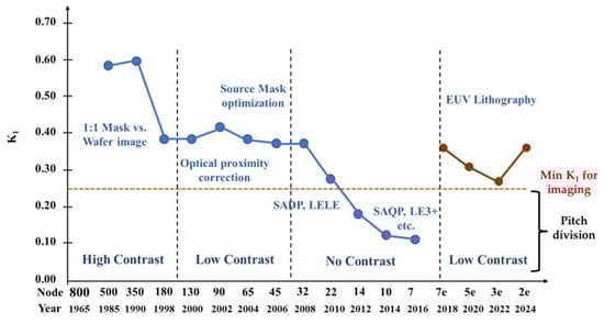 The theoretical limit of the k1 is about 0.25. When k1 is smaller than 0.25, the image contrast is very low so that there is no image that can be printed. As Figure 13 shows, in earlier years, the k1 factor is above 0.5 when the imaging has high contrast, and there is no need to implement various PETs. When the k1 factor is below 0.5, it moves to the low-contrast era, where various PETs are required, such as optical proximity correction (OPC), and source mask optimization (SMO) [146,147,148]. In both high-contrast and low-contrast eras, the patterning has been achieved through single exposure and single etch approach. The wavelength has been reduced from i-line to KrF to ArF, and the NA has been enlarged to achieve the required resolution following Moore’s Law.