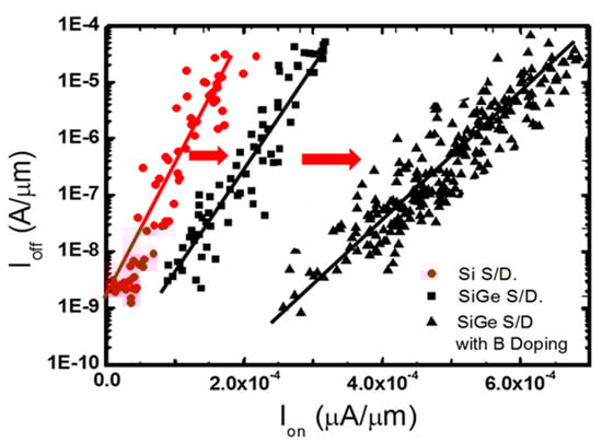 Additionally, some enhancement methods to booster device performance, such as strain, new materials for the channel, access to contact, and spacers, have been recommended. With applications ranging from induced strain engineering [104] to the finite thin SOI layer of FDSOI [105], the general use of channel strain materials (intrinsically strained) is a very effective method [106,107]. Typical strained channel materials are biaxial tensile strain Si or biaxial compressive strain Ge on the SiGe layers, or uniaxial stress induced by the SiGe source/drains layer. Nitride liners are also commonly used to add stress to FETs [108,109]. However, strain integration in these low-dimensional channels is very challenging. An appealing approach to enhance the performance of such low-dimensional devices by boosting the carrier mobility is to replace the Si channel with a high-mobility material, such as Ge, SiGe, and III–V [110,111].