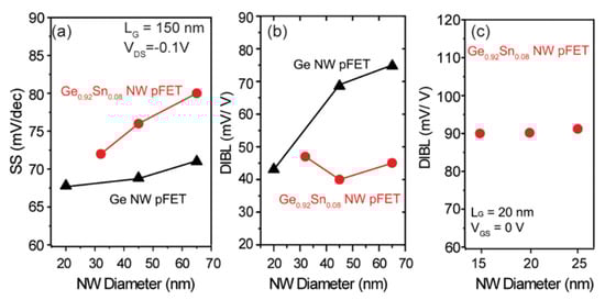 - Kang, Y.; Han, K.; Kong, E.Y.-J.; Lei, D.; Xu, S.; Wu, Y.; Huang, Y.-C.; Gong, X. The First GeSn Gate-All-Around Nanowire P-FET on the GeSnOI Substrate with Channel Length of 20 nm and Subthreshold Swing of 74 mV/decade. In Proceedings of the 2019 International Symposium on VLSI Technology, Systems and Application (VLSI-TSA), Hsinchu, Taiwan, 22–25 April 2019; pp. 1–2. [Google Scholar] [CrossRef]