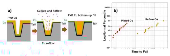 - Pedreira, O.V.; Croes, K.; Zahedmanesh, H.; Vandersmissen, K.; Van Der Veen, M.H.; Gonzalez, V.V.; Dictus, D.; Zhao, L.; Kolies, A.; Tőkei, Z. Electromigration and Thermal Storage Study of Barrierless Co Vias. In Proceedings of the IEEE International Interconnect Technology Conference (IITC), Santa Clara, CA, USA, 4–7 June 2018; pp. 48–50. [Google Scholar] [CrossRef]