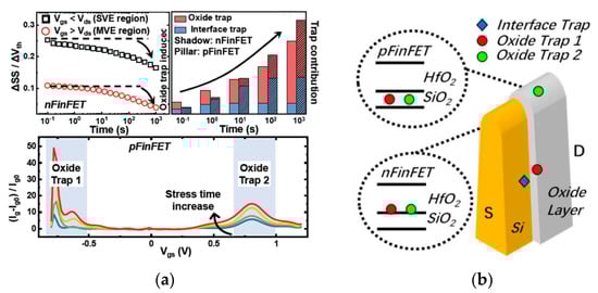 - Chang, H.; Zhou, L.; Yang, H.; Ji, Z.; Liu, Q.; Simoen, E.; Yin, H.; Wang, W. Comparative Study on the Energy Distribution of Defects under HCD and NBTI in Short Channel p-FinFETs. In Proceedings of the 2021 IEEE International Reliability Physics Symposium (IRPS), Monterey, CA, USA, 21–25 March 2021. [Google Scholar] [CrossRef]