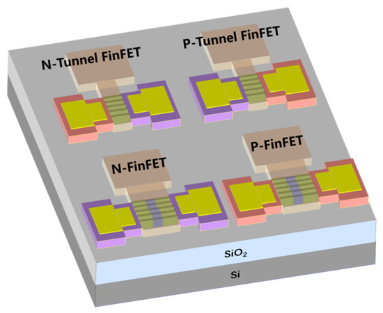 The development of CMOS technology is reaching its final stage where the transistor structure appears to be the most complicated. After more than fifty years following Moore’s Law, the technology roadmap will finally be finishing in a few years. Simply, downscaling is approaching a brick wall where our technology is unable to continue developing beyond the 3 nm node anymore. The main issues are the uniformity, reproducibility, and quality of nanomaterials in mass production when the threshold has been reached. At that stage, where we are not able to pack more transistors in a lateral direction on the chip, we try to pack them in a vertical direction [1,2,3]. Then, the vertical transistors are designed with GAA in mind to create an innovative idea for tackling the SCEs. However, this design is very appealing, but creates a lot of difficulties such as creating contacts between metal and individual or stacks of transistors [4,5]. Therefore, other approaches, e.g., nanosheet (NS) transistors and fin field-effect transistors (FinFETs) which are fully depleted on SOI (FDSOI) wafers, have recently been proposed. In this way, the issue of SCEs is diminished; furthermore, we will still be able to scale down the transistors for some years to come. In the FDSOI technology, the issue of transistor SCEs is solved, but manufacturing the required SOI wafers appears to be a new challenge. The vertical scaling of SOI wafers will suffer from the non-uniformity of the Si cap and oxide box thickness. This means that it is not easy to manufacture SOI wafers to follow scaling-down procedures to reach a few nanometers (nm). A brilliant solution is to turn over the CMOS technology to TFETs where band-to-band tunneling (BTBT) requires significantly lower power consumption. Such types of chips will fulfil all the demands for low power consumption, which has been the in Moore’s technology roadmap for years. Although TFETs offer an excellent platform for the industry, the problem of the stability of tunneling effect is still unsolved [1,3].