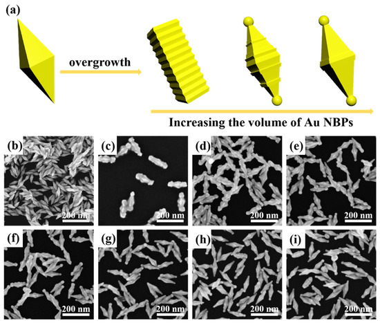 Figure 1. (a) Schematic illustration of the synthetic process of R-Au NBPs. SEM image of pure Au NBPs (b). SEM images of R-Au NBPs with different volumes of the added pure Au NBPs. The added volume of Au NBP solution was 0.5 mL (c), 0.75 mL (d), 1 mL (e), 1.25 mL (f), 1.5 mL (g), 1.75 mL (h), and 2 mL (i).