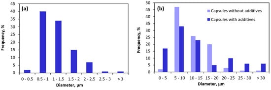 The particle size distribution of the electrosprayed and spray-dried capsules is depicted in Figure 3. The particle size distribution of nano-microcapsules obtained by electrospraying was significantly narrower (ranging from 0.5 to 3.1 µm) compared to that of the microcapsules produced by spray-drying (ranging from 4.6–3.4 to 39–36 µm with/without the presence of additives, respectively). For an electrospraying technique, capsules with an average size of 1.2 ± 0.5 µm were produced, with 91% of them having a diameter below 2 µm. This smaller particle size obtained employing the electrospraying method is attributed to the breakup of droplets through Coulombic repulsion forces during the process, promoting the formation of ultrafine encapsulates with a narrow diameter distribution at the high voltage used (22 kV) [35]. This is also facilitated by the presence of Tween 20 as a surfactant, as it reduces the surface tension and aids in the disintegration of droplets, leading to the formation of finer and smaller particles [47,65].