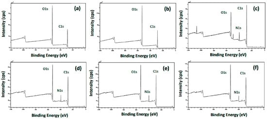 XPS spectra of Arabic gum (a), pullulan (b), Tenebrio molitor hydrolysate (c), and electrosprayed capsules (d) and spray-dried capsules with (e) and without additives (f).