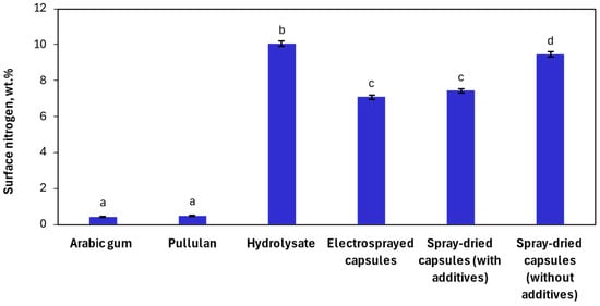 Percentage of the mass concentration of nitrogen on the surface of Arabic gum, pullulan, Tenebrio molitor hydrolysate, and the produced nano-microcapsules. Different letters denote significant differences between samples (p ≤ 0.05).