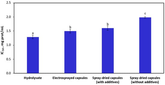 In comparison, the electrosprayed encapsulates as well as the spray-dried encapsulates containing additives showed a similar percentage of DPP-IV inhibition when compared to the free hydrolysate, with an IC50 value of 1.50 ± 0.07 mg protein/mL 1.61 ± 0.08 mg protein/mL, respectively. On the other hand, the spray-dried capsules without additives presented a significantly higher IC50 value (1.99 ± 0.03 mg protein/mL) when compared to those of the electrosprayed and spray-dried (with additives) capsules. Therefore, the DPP-IV inhibitory activity decreased by 16.16%, 24.13%, and 53.60%, respectively, for the electrospraying, spray-drying with additives or spray-drying without additives in the encapsulation processes. It is worth noting that Garzón et al. (2023) reported higher values, around 3.5 mg protein/mL, for the encapsulates obtained by spray-drying using agar and/or carrageenan together with maltodextrin as carriers when encapsulating a hydrolysate with an initial IC50 value around 1.5 mg protein/mL [40].