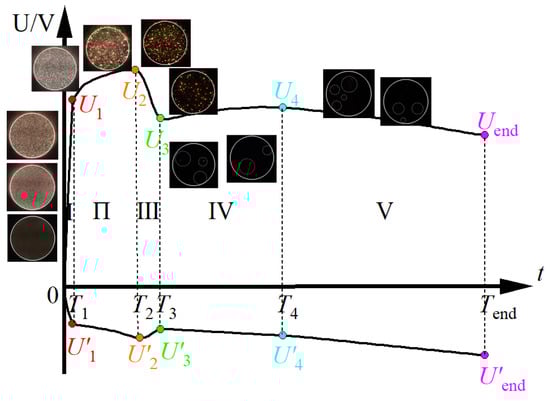 The micro-plasma discharge occurring on the surface of aluminum alloy constitutes a complex dielectric barrier discharge, which serves as the defining characteristic of micro- arc oxidation (MAO). This discharge phenomenon includes breakdown of the alumina film in both solid and gas mediums due to redox reactions. Multiphase surface discharges within micropores may also occur, which can directly influence mass transfer and phase change dynamics during the ceramic film growth process. Consequently, the growth state of the ceramic film can be effectively elucidated by monitoring plasma discharge behavior and dynamic voltage variations applied to the sample [13]. The micro-plasma discharge behavior and the dynamic voltage curve under the action of positive and negative pulses during the growth of the ceramic film of sample # 9 are shown in Figure 2. By examining the evolution of the positive voltage signal and the characteristics of micro-plasma discharge, the growth process of the ceramic film can be delineated into five distinct stages.