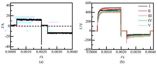 Waveforms of voltage pulses at the output of the power supply at different processing times. (a) current waveform, (b) voltage waveform.