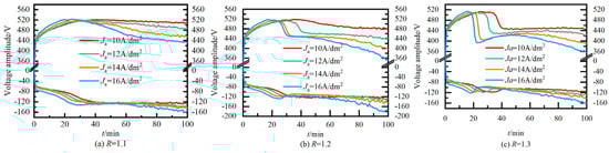 Notably, the change trends of T, U, and k in the negative voltage curve closely mirror those observed in the positive direction. In Figure 5a, it is evident that the T2 time of the process voltage curve for the ceramic film obtained under Ja = 10A/dm2and R = 1.1 occurs at the latest time, 44 min. Conversely, the T2 time under Ja = 16A/dm2and R = 1.3 is the earliest, manifesting at 16 min, preceding the former by 28 min. Notably, the change trends of T, U, and k in the negative voltage curve closely mirror those observed in the positive direction.
