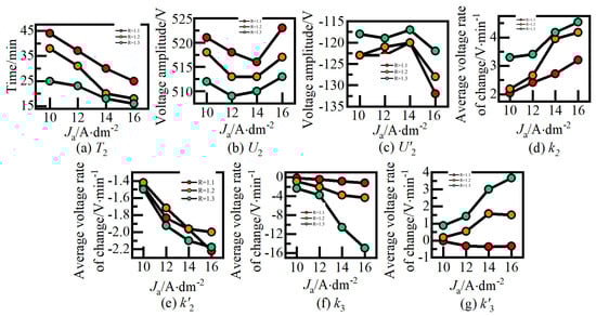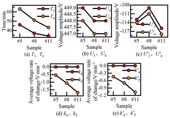 In Figure 6, (a), (b), (d) are positive voltage curve, (c), (e) are negative voltage curve. It is notable that the change trend of the negative electrode voltage-time response curve aligns closely with that of the positive electrode process. As depicted in Figure 6, with the increase of Ja, T3 (T′3) and T4 (T′4) advance at the time of entering stage IV and V, respectively, while the corresponding initial voltage values U3 (U′3) and U4 (U′4) decrease. Furthermore, the average change rates k4 (k′4) and k5 (k′5) of stages IV and V increase with the rise of Ja. Notably, k4 approaches 0, while k5 varies between −0.5 and −1.7 V/min.