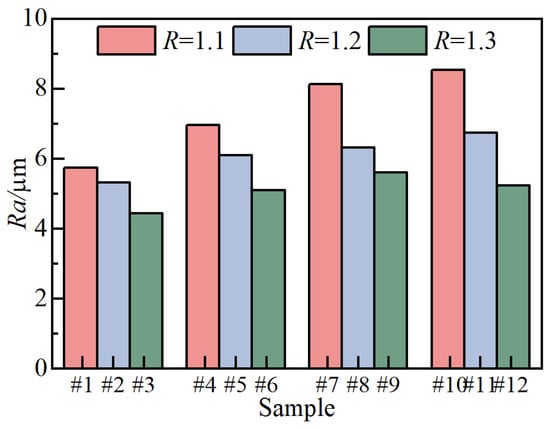 Figure 8 depicts the surface roughness measurement results of 12 groups of ceramic films. The roughness Ra of the ceramic films falls within the range of 4–8 μm. Notably, sample #10 exhibits the highest roughness, while sample #3 displays the lowest. The roughness value of the ceramic film decreases with increasing R and increases with rising Ja. Upon examination of the surface morphology observed in Figure 8, it can be concluded that the former is attributed to the heightened distribution of molten oxides on the ceramic film surface, while the latter is attributed to the higher number of ceramic ball particles scattered on the surface.