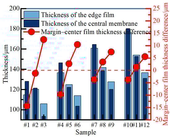 Figure 9 presents a comparison of the center and edge film thickness of the 12 groups of ceramic films, including the difference between the two. The inconsistent film thickness of the ceramic film in different regions stems from the selective growth of the film induced by the uneven distribution of current on the sample surface. The primary factor contributing to the variation in film thickness between the middle plane and the edge is the interface type. While the plane and the electrolyte exhibit two-dimensional unidirectional contact, the edge and the electrolyte involve spatially multi-angle contact. As a result, atoms at the interface deviate from their equilibrium positions to differing extents, leading to an increase in energy. This increase in energy is referred to as interface energy. Notably, the interface energy of the system at the edge surpasses that of the plane area, resulting in an overall increase in the system’s internal energy and a tendency towards stability in the region. On the other hand, the specific surface area of atoms and ions at the edges and vertices exceeds that of the planar region, facilitating the adsorption of negatively charged micelles in the electrolyte and the formation of discharge centers. These factors contribute to the propensity for breakdown and preferential growth at the film edges. As the ceramic film thickness increases, edge growth stops because it becomes more difficult to break down, resulting in a notable growth rate improvement at the center of the film [18]. The results from Figure 9 reveal that the center-edge difference in ceramic film thickness is most pronounced in samples #3 and #1, measuring 15 μm and −15 μm, respectively. Spatial distribution differences in ceramic film thickness are minimal under R = 1.2 parameters, nearly approaching 0. When Ja remains constant, the growth of ceramic films after 100 min of treatment at R = 1.1, 1.2, and 1.3 results in intermediate thickness, uniform thickness, and edge thickness, respectively. This may be attributed to the fact that increasing R promotes the dissolution reaction (1) of the film layer at the electrolyte/film interface during cathode pulse, thereby slowing the film surface growth rate and inhibiting edge preferential growth mode [19]. From the trend of change, continuing to increase Ja, the thickness difference between the center and the edge of the ceramic film will be infinitely close to zero.