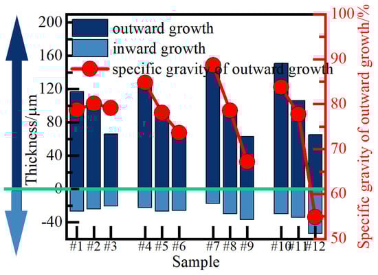 Figure 10 illustrates the disparity between the internal and external growth of the 12 groups of ceramic membranes. It is evident from the figure that the thickness of the outward growth of the ceramic membrane under different current density parameters exceeds 50% of the total thickness, consistently displaying stronger outward growth behavior compared to inward growth. Of the samples tested, sample #7 had the smallest inward growth thickness and proportion of ceramic membrane, resulting in a matrix erosion ratio of 11%. Conversely, sample #12 exhibits the largest inward growth thickness and proportion, with a matrix erosion ratio of 46%.