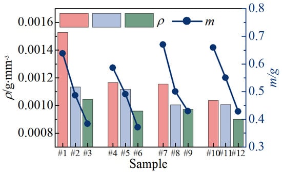 Figure 11 illustrates the density comparison of 12 groups of ceramic membranes, alongside the corresponding film weight data. The two curves depicting density and film quality exhibit a similar trend with changes in current parameters. Notably, the density of the #1 ceramic film, prepared with Ja = 10A/dm2 and R = 1.1, is the highest at 0.0015 g·mm−3. Conversely, the density of the No.12 ceramic film, prepared with Ja = 16 A/dm2 and R = 1.3, is the lowest, measuring only 0.0009 g·mm−3, marking a decrease of 40%. When Ja remains constant, an increase in R leads to a linear decrease in both the weight and density of the film. This observation suggests that heightened cathode pulse intensity is not conducive to the growth of alumina grains, resulting in decreased film density. Conversely, when R is constant, an increase in Ja enhances the quality of the ceramic membrane but reduces its density. This indicates that while increased pulse energy accelerates the film formation process, the resulting particles are loose, thereby decreasing film density.