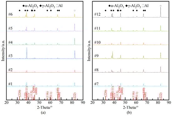 Phase composition of the micro-arc oxidation ceramic film. (a) Samples 1 to 6; (b) Samples 7 to 12.
