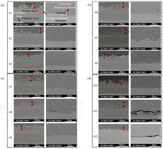 Cross-sectional microscopic morphology from matrix to ceramic film surface. (a) Sample#1–#3. (b) Sample#4–#6. (c) Sample#7–#9. (d) Sample#10–#12.