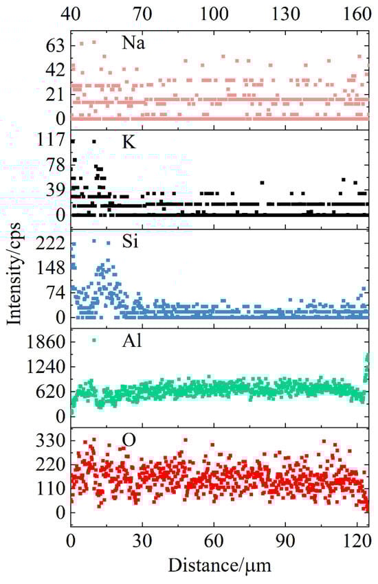 In accordance with the cross-section SEM image of the #9 ceramic film in Figure 14, a perpendicular line segment was drawn from the film layer’s surface to the substrate side for line-scanning EDS elemental analysis, as shown in Figure 16. The abscissa’s zero point corresponds to the outer surface of the ceramic film near the electrolyte side. Examination of the results reveals that the micro-arc oxidation ceramic film is primarily composed of O and A, with smaller quantities of Si, K and Na from the electrolyte. Notably, the Al element is the most prevalent, constituting over 50%, followed by O. The distribution of O and Na elements is relatively uniform throughout the film, whereas Si and K elements exhibit a distinct peak within the 20 μm wide surface porous layer of the ceramic membrane, with even dispersion in other membrane layer areas. The distribution of Al element increases gradiently in the near-surface area of the ceramic membrane about 2 μm and the transition layer in contact with the matrix. It can also be judged that these two areas are mainly responsible for the subsequent outward and inward growth of the ceramic membrane. There is a valley value of Al element distribution in the film layer corresponding to the peak distribution of Si and K elements. This local unbalanced element distribution may be affected by the formation defects of the porous layer of the ceramic film.