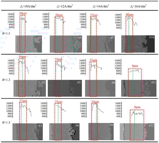 Conversely, if Ja remains constant, increasing R leads to a narrower high hardness zone within the film, accompanied by an increase in depth. This outcome suggests that the outward growth behavior of the ceramic film is inhibited under these conditions. Notably, ceramic films #11 and #12 exhibit the highest hardness of approximately 900 and 800 HV, respectively. This discrepancy may be attributed to the compromised integrity of the transition layer in these samples, resulting in inadequate thermal insulation and hindering the phase transition from γ-Al2O3 to high hardness α-Al2O3. Consequently, the overall film hardness is diminished.