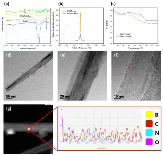 (a) FTIR spectra of CA, PA, BNNT-neat and BNNT-CAPA. (b,c) TGA and Zeta potential of BNNT-neat and BNNT-CAPA. (d–f) TEM image and (g) elemental line scan of BNNT-CAPA.