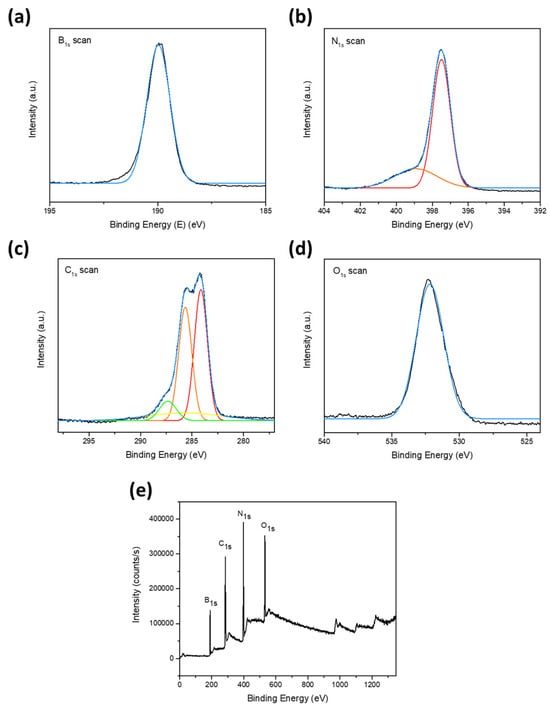 XPS survey of the surface-modified BNNT. (a) B 1s; (b) N 1s; (c) C 1s; (d) O 1s; (e) high resolution spectra.