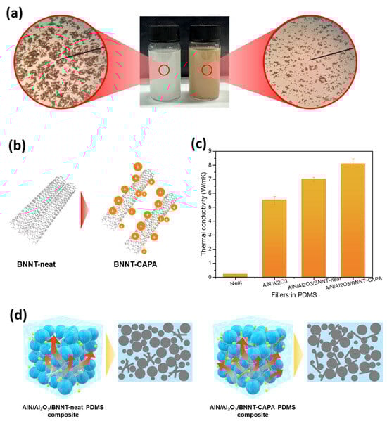 AlN particles were acquired from Thrutek. Al2O3 microparticles were purchased from Denka Korea. Catechol (CA), tetraethylenepentamine (PA), and tannic acid (TA) were obtained from Deajung Korea. Tris HCl (1M) was bought from Hanlab. The BNNT powder (diameter: 30–50 nm, length: ~10 µm, Purity: >80%) was synthesized through a thermochemical reaction of boron powder with nitrogenous gases. The purity of BNNT suggests the fractional concentration of nanotubes by weight, while the remainder is h-BN nanoparticles and nanoflakes. PDMS resin, hardener, retardant, and curing agent were supplied by MQ Korea.