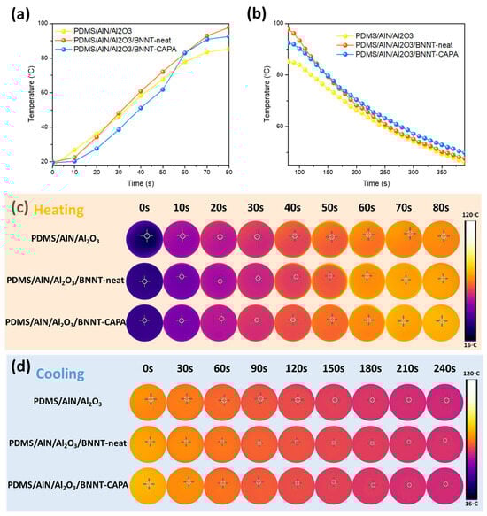 The corresponding heating and cooling profiles of the fabricated composite were examined and are shown in Figure 6a–d. All of the prepared samples demonstrated an increasing trend toward heat exposure, implying their viability to dissipate heat from the heat source. It can be recognized that the composite incorporated with BNNT-CAPA projects the highest heating profile, parallel to the thermal conductivity results, which can be associated with the effective continuous network establishment of the well-dispersed BNNT-CAPA. This validates the efficiency of the organized framework on the thermal flux dissipation. Due to the improved thermal conductivity of the BNNT-CAPA-incorporated composite, it exhibited the highest interfacial thermal elevation, reaching 98.4 °C after 80 s, while the BNNT-neat compounded and AlN/Al2O3-neat samples attained 93.7 °C and 79.8 °C. The relative increase in the interfacial temperature of the BNNT-CAPA assimilated samples indicates an improvement in the phonon pathway network formation due to the effective dispersion of BNNT. It should also be noted that the cooling propagation of the BNNT-CAPA samples demonstrates rapid cooling in comparison with the sample of that of BNNT-neat. This proves the superiority of the heat conduction pathway construction of the modified BNNT in comparison to its neat counterpart.