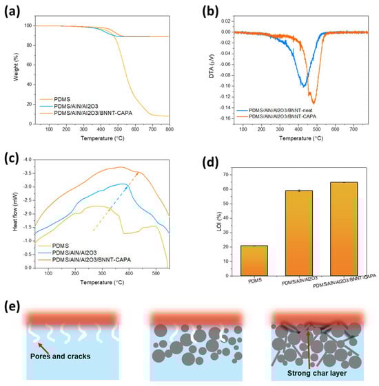 Flammability characteristic investigation using (a) LOI, (b) TGA, (c) differential thermal analysis (DTA) curves and (d) DSC and (e) the flame-retarding mechanism of BNNT-incorporated composite.