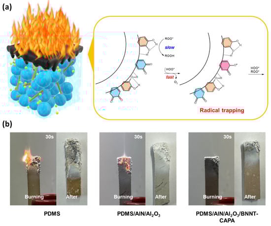 It can be observed that a shift in the deterioration of temperature is observed upon the introduction of BNNT-CAPA, which affirms its thermal stability reinforcement contribution. This is also shown by the DSC measurements illustrated in Figure 7c, confirming the association between crystallinity alterations and the BNNT-CAPA incorporation. The phase change temperature of the prepared samples shows an increasing trend, relative to the following order: PDMS, PDMS/AlN/Al2O3, and PDMS/AlN/Al2O3/BNNT-CAPA. The glass transition propagation of pure PDMS samples was examined through DSC analysis and exhibited a Tm of 330.89 °C. Upon incorporation of the organic fillers, the Tm changed to 395.75 °C, with an enhancement of approximately 64.89 °C relative to PDMS-neat. The Tm was further increased by the assimilation of BNNT-CAPA, reaching up to 434.29 °C, with a relative elevation of 38.54 Tm in correlation with PDMS/AlN/Al2O3 samples. The melting point Tm of the BNNT-CAPA-integrated sample shows a massive increase relative to its small incorporating amount of 1%, showcasing its influence on the composite’s thermal durability properties, which can be ascribed to BNNT’s distinct thermal stability dominance and potent intrinsic permanence. The LOI trend is relatively synonymous with the TGA and DSC data, with LOI measurements of 20.8%, 58.97%, and 64.77%, corresponding to PDMS-neat, PDMS/AlN/Al2O3, and PDMS/AlN/Al2O3/BNNT-CAPA. The substantial augmentation in the thermal stability of BNNT-CAPA-incorporated samples is accredited to the following facets: effective dispersion, good charring capability, and radical trapping []. The effective dispersion of BNNT onto the polymeric matrix establishes a strong confinement effect due to its dominant nitrogen amount, protecting the mobility of polymeric networks []. A protective char is also heightened by the surface treatment, serving as a barrier that delays the penetration of oxygen and heat and inhibits the release of volatile components in the composite material, as shown in Figure 7e. Moreover, the attachment of the CAPA to the BNNT’s interface provides an additional supplementation, aside from its dispersive contribution. As a dopamine derivative, CAPA also possesses intrinsic fire repellence properties, imposing a radical scavenging effect, as demonstrated in Figure 8a [,]. The trapping of these free radicals imposed a suppression of the occurrence of further ignition and combustive reactions, thereby impeding the spread of fire []. This claim is analogous to the actual flame retardation shown in Figure 8b, where composite samples were exposed to fire and observed after 30 s. It can be recognized that the PDMS succumbed to flames, which asserts the LOI result, since its value is near the actual concentration of oxygen in atmospheric conditions. On the other hand, the sample infused with BNNT-CAPA established excellent fire repellency after flame exposure, in parallel to the discussed thermal stability analysis.