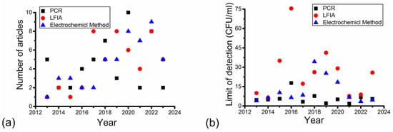 Figure 2b shows that the average annual LOD was different between different detection methods and years. The annual average LOD was usually the highest for LFIA, except for the electrochemical method in 2018. The LOD was usually the lowest in PCR, except for the electrochemical method in 2016 and 2022. In PCR, the average LOD was 4 CFU/mL in 2013. Then, it increased gradually to 18 CFU/mL in 2016 and was followed by a large drop to 3 CFU/mL in 2017. After 2017, it decreased in an overall trend to 2 CFU/mL in 2021. It increased to 6 CFU/mL in 2022. In LFIA, it was 10 CFU/mL in 2013; it decreased to 7 CFU/mL in 2014 and increased tremendously to 75 CFU/mL in 2016. Then, it decreased sharply to 17 CFU/mL in 2017 and was again followed by an increase to 40 CFU/mL in 2019. After that, it decreased gradually to 8 CFU/mL in 2021 and increased again to 25 CFU/mL in 2023. In the electrochemical method, it was 4 CFU/mL in 2013, and it increased gradually to 10 CFU/mL in 2015. After a decrease to 7 CFU/mL in 2016, it increased again to 35 CFU/mL in 2018. Then, it decreased gradually to 3 CFU/mL in 2022.