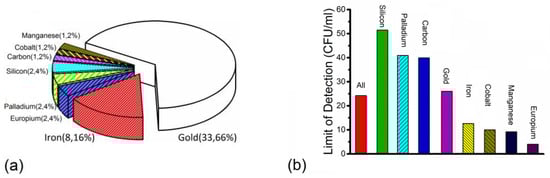 Bacterial detection via LFIA with different nanoparticles (white: gold; red: iron; dark blue: europium; green: palladium; light blue: silicon; pink: carbon; yellow: cobalt; brown: manganese). (a) Number of articles with different nanoparticles. (b) Average LOD with different nanoparticles.