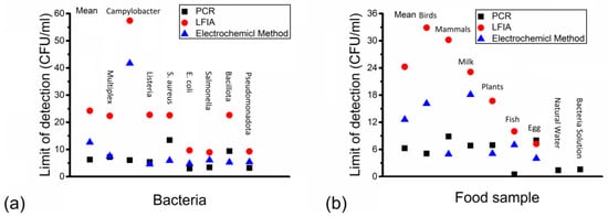 The review of the LODs for PCR, LFIA and the electrochemical method has revealed a trend in this research area that will inform food safety and public health experts. Figure 1a illustrates that the number of articles with multiplex detection capability is the highest in PCR, followed by LFIA and the electrochemical method. That is the main reason that PCR is considered a reliable standard detection method for bacterial detection under many circumstances. However, PCR does have the disadvantages of being a high-cost, time-consuming and complex procedure. As a result, PCR cannot replace LFIA and the electrochemical method for bacterial detection completely. Milk is the most popular food sample for bacterial detection via each detection method.
