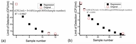 In order to find an accurate quantitative relationship between LODs with different parameters, the LOD should be analyzed against each parameter individually. An exponential relation with relatively high Pearson correction coefficients (R2 > 0.95) can be obtained between the LOD of Listeria in milk via LFIA and the LOD of Listeria in milk via the electrochemical method with a sample number. The details of them can be seen in Figure 6, which shows both the LODs for the original and for the regression of Listeria in milk via LFIA and the electrochemical method.