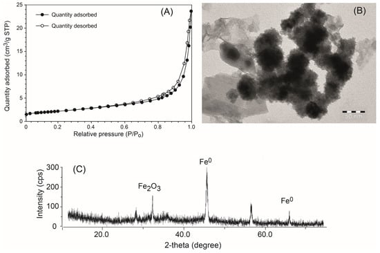 Adsorption/desorption isotherms (type II adsorption isotherms), (A); Transmission Electron Microscope (TEM), (B); and XRD, (C), of the synthesized CMC-nZVI nanoparticles.