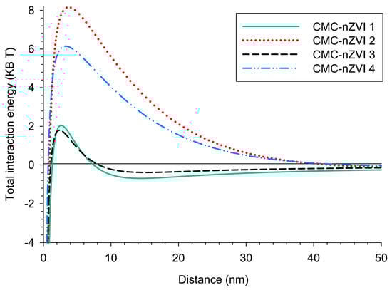 The total interaction energy between nanoaggregates (i.e., CMC-nZVI-CMC-nZVI) is assumed to be created from a sphere–sphere interaction. The calculation was carried out according to Bhattacharjee and Elimelech []. The electrostatic double layer force (EDL) was calculated as