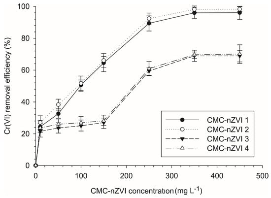 Effect of the concentration of CMC-nZVI nanoparticles on the removal efficiency of Cr(VI). The vertical bars represent the standard deviation of the measurements.