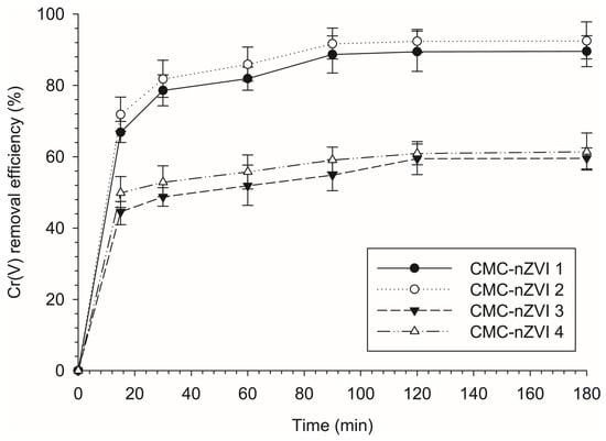 Effect of contact time of CMC-nZVI nanoparticles on the removal efficiency of Cr(VI). The vertical bars represent the standard deviation of the measurements.